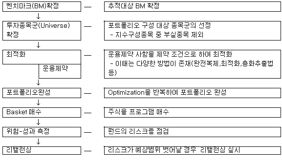 일반적인 운용프로세스는 추종대상이 되는 Index를 BenchMark로 확정한다. 이를 적절히 유지할 수 있도록 투자종목군(Universe)을 설정한다. 이들 종목군을 대상으로 다양한 펀드구성방법을 통해 포트폴리오를 완성한다. 이후 프로그램매매를 통해 (주로 basket trade) 주식을 매수한다. 이후 위험-성과분석을 통해 모니터링을 하고 필요한 경우 리밸런싱(rebalancing)을 하여 다시 추적오차(tracking error)를 최소화 한다.
