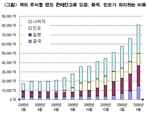 이들 해외펀드들 중 역외펀드의 경우 투자의 대부분이 주식형 펀드로 이루어지고 있다. 역외펀드 가운데 주식형 펀드의 판매잔고에서 인도, 중국, 일본 3개국이 차지하는 비중은 50%내외를 유지해왔는데, 지난 2006 4월말 무렵엔 전체 주식형 판매잔고 86백억 중 49천억을 차지하면서 62% 수준에 까지 이르게 되었다. 또 해외투자펀드의 경우에도 국제주식형 펀드 221개중 상기 3개국이 28%의 비중을 차지하며, 설정액 기준으로는 무려 41%의 수준에 이르고 있다.
