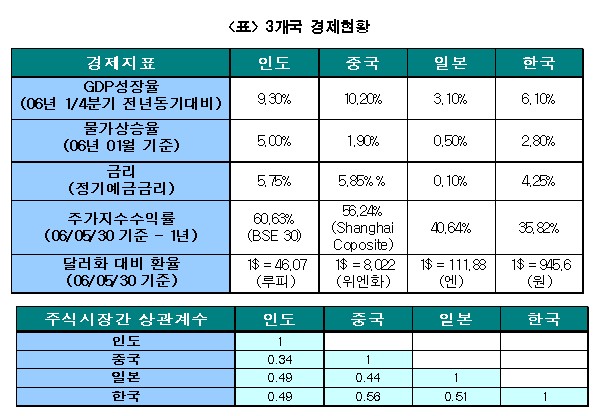 3개국의 경제현황을 간단히 살펴보면, 인도와 중국의 경제성장율은 한국시장에 비해 높은 것으로 나타나고 있다. 지난 1년간 세계 주식시장의 동반상승세가 있었기 때문에 각 시장별로 40%~ 60%의 주가지수상승율을 기록하였다. 외환추세는 전반적인 대미달러화 약세로 인해 현지통화의 강세가 나타났다.