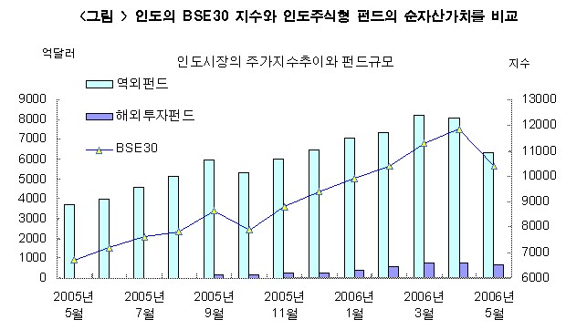 인도 증시는 지난 몇 년간 최대의 활황을 누려왔다. BSE30 (Bombay Stock Exchange 30Index :뭄바이 지수)는 지난 1년간 꾸준히 증가추세에 있다가 지난 2006 5월에 갑작스런 하락추세에 직면하게 되었다.