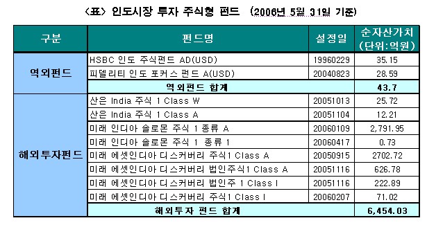 이들 펀드의 순자산가치는 <그림>에서 알수 있듯이 인도증시의 상승에 따라 높아짐을 알 수 있다. 역외펀드는 HSBC 10여년의 운용기록을 갖고 있는 펀드가 있으며 이외 해외투자펀드는 국내운용사인 산은자산운용과 미래계열 운용사 등이 최근 들어 적극적으로 운용하려고 노력하고 있다.