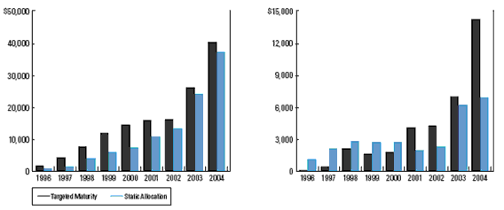 그러나 2001년부터는 달라졌다. 목표만기 전략펀드로 더 많은 돈이 들어오는 추세다. 2004년에는 두 종류의 전략 펀드로 각각 60억 달러가 넘는 자금이 유입되면서 차이는 근소했다. 그러나 2004년 목표만기는 전년에 비해 두 배 가량 늘어난 150억 달러를 기록한 반면, 정적할당은 전년 수준을 약간 웃도는 70억 달러에 그쳐 둘 사이의 차이가 두 배로 벌어졌다.