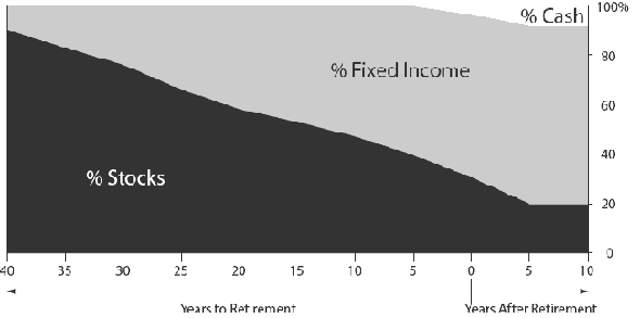 가령 뱅가드는 퇴직시기가 2045년인 투자자를 위해선 주식 90%, 채권 10%의 비중을 유지하지만, 2005년 퇴직자를 위한 자산할당은 주식 35%, 채권 65%로 바뀐다. 반면 T.Rowe Price는 2005년 퇴직자를 위한 자산할당을 주식 55%, 채권 45%의 아주 공격적인 포트폴리오를 가져간다.