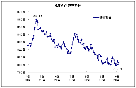 최근 일본 펀드 투자자들 사이에서 환 헤지 여부에 따라 희비가 엇갈리는 일이 벌어지고 있다. 그림에서 알 수 있듯이 지난 6개월간 원-엔환율이 하락을 거듭하는 등 엔화 가격이 떨어지고 있기 때문이다. 엔화표시 펀드에 투자한 고객들은 펀드자체의 수익률과 상관없이 엔화가치 하락비율만큼 손실을 본 것이다.