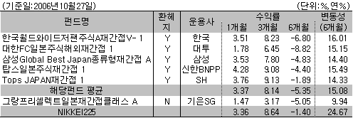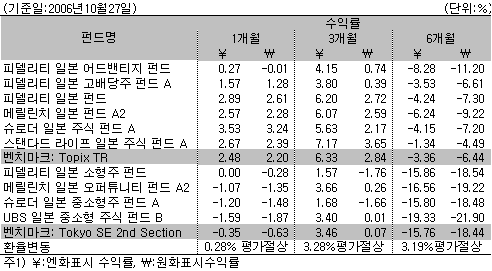 원화대비 엔화가치가 떨어졌던 지난 6개월간을 살펴보면 원화표시 수익률이 엔화표시 수익률에 비해 작음을 알 수 있다. 엔화표시 수익률은 펀드가 투자한 자산의 수익률 그 자체이지만 원화표시 수익률은 펀드를 엔화로 환매한 후 다시 원화로 교환한 수익률이므로 엔화가치 하락폭이 반영된 것이다. 만일 엔화표시 펀드에 투자한 후 그만큼 환헤지를 한 투자자라면 환가치 변동에 따른 손실을 거의 보지 않아도 되기 때문에 엔화표시 수익률이 본인의 투자수익률이 되고, 환헤지를 안한 투자자라면 원화환산 수익률이 본인의 투자수익률이 된다. 예컨대 펀드의 기준가격이 $100에서 $110로 상승시 환율이 $1,000에서 $1,100으로 변했다면 달러표시 수익률은 10%(=$110/$100-1)이지만 원화환산 수익률은 21%(=($110*\1,100)/ ($100*\1,000)-1)가 되는 것이다. 극단적으로 펀드의 기준가격은 변동하지 않고 환율만 $1,000에서 $1,100으로 변했다면 $표시수익률은 0%이지만 원화환산수익률은 10%가 되는 것이다.
