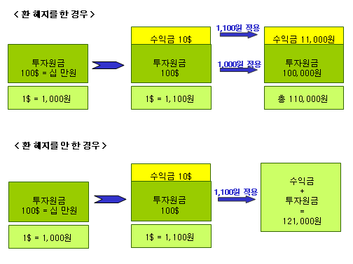 기본적으로 해외펀드 투자는 펀드와 외환 두 가지 대상에 대해 투자를 하는 것이다. 만약, 투자지역이 전세계에 걸쳐있는 글로벌 펀드라면 펀드를 구성하는 통화가 다양해져 환율변동으로 인한 효과를 서로 상쇄시킬 수 있으나, 특정 지역이나 국가에 투자하는 펀드라면 환율변동으로 인한 수익률저하를 막기 위해선 환 헤지를 해야한다.