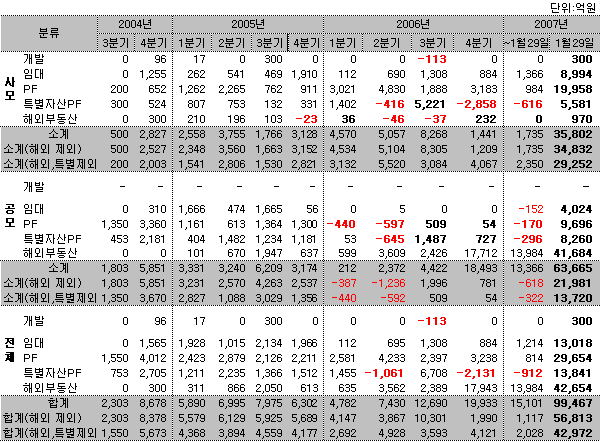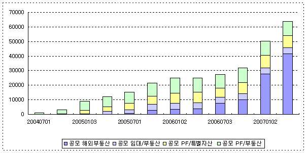 최근 공모시장에서의 최대관심사는 공모 임대/재간접(해외 REITs펀드) 펀드로, 국제적인 상업용 부동산 호경기와 글로벌 유동 자금이 유입으로 높은 수익률을 기록하고 있다. 높은 수익률에 몰리는 유동 자금의 성격을 감안할 때 해외부동산펀드로의 자금유입은 당분간 지속될 전망이다. 더욱이 해외운용사가 현지에서 만든 역외 부동산펀드의 국내 판매가 허용될 것으로 알려져 투자자들의 관심을 끌고 있다. 다만, 지난 3년간 세계적으로 부동산 가격이 오른 점과 미국의 주택 경기가 침체되고 있는 점은 불안 요소이다. 따라서 높은 수익률에 현혹되어 한 지역에 집중 투자하는 것보다는 글로벌 분산 투자하는 것이 바람직할 것이다.