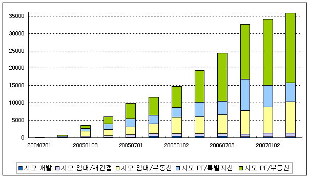 사모펀드의 분기별 설정현황을 살펴보면 사모 임대/부동산과 사모 PF/부동산의 증가가 눈에 띈다. 특히 2006년 공모 임대/부동산이나 공모 PF/부동산이 정체되거나 설정액이 줄어드는 상황에서 사모 임대/부동산과 사모 PF/부동산은 연 평균 설정액 각각 749억, 3290억 증가하였다.