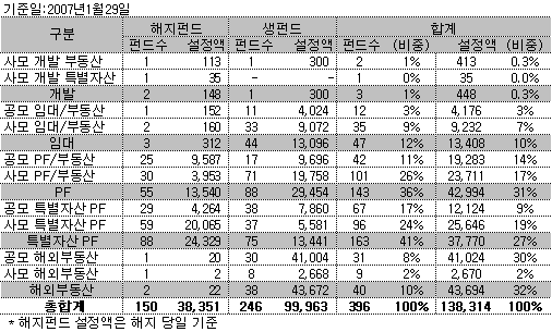 지난 2004년 6월이후 설정됐던 부동산 펀드의 유형은 투자위험이 큰 개발형, 임대형보다 개발사업에 자금을 대출하여주는 PF형 펀드가 대부분을 차지하고 있다. 1월29일 현재까지 만들어진 396개 13조8천억원의 부동산 관련펀드를 조사한 결과,  PF형(특별자산 포함)이 306개(77%), 8조764억원(58%)으로 압도적 다수를 차지했다. 해외부동산펀드 투자형이 40개 4조3,694억원, 개발형은 3건(448억원), 국내임대형이 47건(1조3,408억원)에 달했으나 개발형은 3건(448억원)에 불과했던 것으로 집계됐다.