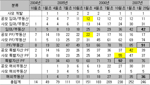 펀드 수와 설정액의 변동을 살펴보면 최근 들어 공모 PF나 공모 임대형 펀드의 설정이 뜸한 것을 알 수 있다. 특히 2006년 들어서 관련시장은 급속히 냉각되어 설정액이 감소하는 등의 모습을 보이고 있다.