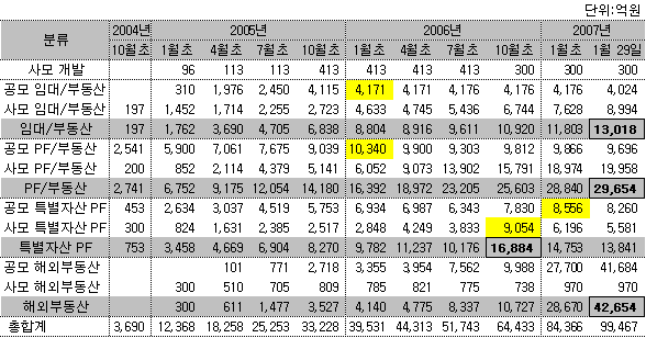 특별자산 PF의 경우 꾸준한 증가세를 보이다가 2006년 10월초 급격한 증가를 보이다가 현재는 감소추세로 돌아섰다.