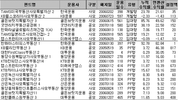 공모펀드로서 임대형과 개발형은 위험성이 큰데다 투자기간이 3년 이상으로 길기 때문에 그리 많은 펀드가 만들어지지 못했다. 때문에 상환된 펀드들은 대부분 PF형이다. 이 펀드들의 상환수익률은 연환산 7%대가 대다수인 가운데 정상적인 운용이 이루어진 펀드의 경우 최저 1.02%에서 16.00%에 이르렀다. 일반적인 채권펀드에 비해 1~3% 초과하는 수익률을 올린 PF형은 채권펀드의 대체투자자산으로서의 소임을 잘 수행한 것으로 보인다.