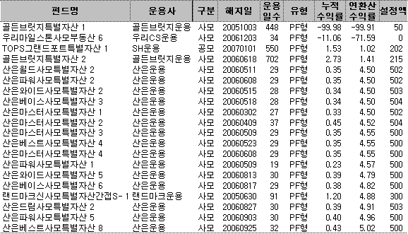 정상적인 운용이 이루어지지 않은 펀드들로 KB운용의 개발형 펀드는 물류센터 신축공사에 투자했으나 공사 중 붕괴사고로 투자자금을 중도에 회수한 케이스이고, 높은 수익률을 올린 임대형 펀드들은 임대건물 매각차익으로 인한 것으로 조사되었다. 그외 이상수익률을 보인 펀드들은 토지매입이 안되거나 부동산입찰에서 떨어지거나 시행사의 계약위반으로 인한 조기청산, 회계처리상의 문제 등이 있는 것으로 판명되었다.