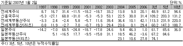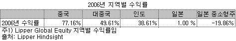 지난 10년간 일본 주식펀드는 전세계 주식펀드와 신흥국 주식펀드의 성격이 혼재된 것처럼 보인다. 5년 누적수익률(65.6%)은 전세계 주식펀드(61.2%)와 유사한 수준이다. 반면 10년 누적수익률은 90년대 지속되었던 장기 경기침체의 영향을 받아 36%에 불과하다. 전세계 주식펀드의 누적수익률 94.6%에 비해서도 형편없는 수준이다. 다만 최근 3년 누적수익률은 일본 경기회복에 힘입어 전세계 주식펀드를 13%포인트 높은 성과를 보이고 있다. 특히 2005년도의 수익률은 신흥국 주식펀드 수익률보다도 16%포인트 이상 초과했다. 이는 그 동안 주가에 반영되지 못했던 요인들이 일시에 반영된 결과로 보인다. 그 결과 2005년 이후에는 세계증시흐름과는 상이한 모습을 보이고 있다. 따라서 2006년 주가에 반영되지 못한 경기회복 영향력이 2007년에 반영될 것이라는 기대감이 한껏 높아진 상태다.
