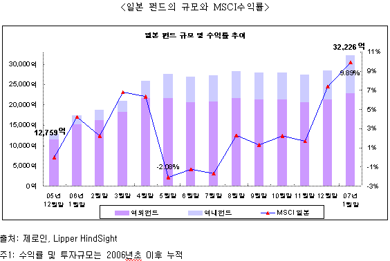 마지막으로 일본펀드 투자함에 있어 이머징마켓의 대안으로 삼는 것은 부적절할 것이다. 2006년 3월말과 2007년 1월말을 살펴보면 투자규모가 수익률에 후행하는 모습을 보이는데, 높은 수익률을 보고 투자하기엔 일본시장은 이머징마켓과는 그 변동성을 달리하는 선진국 시장이다. 따라서 높은 수익률만을 바라보고 접근하기 보다는 포트폴리오 분산차원에서 안정적인 시각으로 접근하는 것이 필요하다.