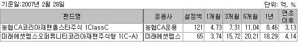1개월 이상 성과가 존재하는 한국 및 일본주식에 혼합 투자하는 펀드는 현재 두 개가 존재한다.  ‘농협CA코이라재팬올스타주식 1Class A’과 ‘미래에셋맵스오퍼튜니티코리아재팬주식형 1(C-A)’이 바로 그 것이다. 두 펀드의 6개월 수익률은 농협이 11.04%, 미래에셋이 20.21%로 큰 차이를 보이고 있다. 이유는 농협이 한국 대 일본 비를 45:45로 동일하게 가져감에 비해 미래에셋은 유동적으로 시장상황에 따라 조정해 나가기 때문으로 보인다.