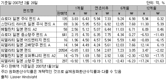 최근까지 엔화가 약세를 보이고 있는 원인은 제로금리정책에 따른 구미와의 금리격차, 적극적인 해외투자로 인한 자금 유출, 일본 수출기업의 글로벌화, 엔 캐리 트레이드 확대 및 외화선물 거래 등을 꼽을 수 있다. 그 결과 2006년 1월 7일 867.65원을 정점으로 2007년 2월 12일에는 766.2원까지 떨어져 최고점 대비 11.7%의 하락률을 보였다. 따라서 일본펀드에 있어서 환헤지의 중요성은 간과할 수 없다. 개별적으로 환헤지 여부를 결정해야 하는 역외펀드의 경우 환헤지를 하지 않았을 경우 수익을 내고도 원화로 환산시 수익이 축소되거나 심지어 손실을 보는 경우가 발생하였다. 2월 28일 엔화환율이 반등한 결과 1개월 연초이후의 경우 원화수익률이 엔화 수익률보다 높게 나타났지만, 6개월 12개월의 경우 엔저현상의 영향으로 인해 원화로 환산시 수익이 적어지고 손실이 커지는 경향을 나타내었다.