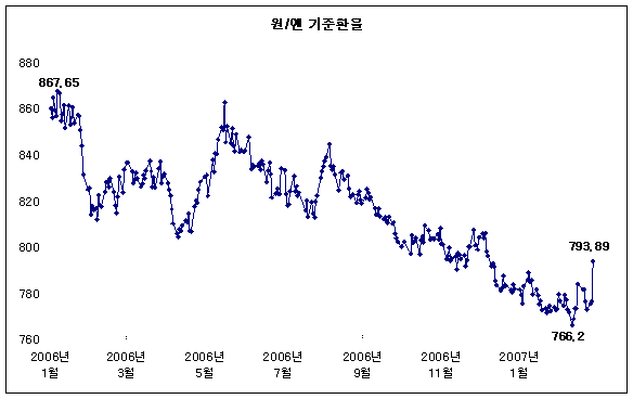 향후 추가적인 엔화가치상승을 위한 조건으로는 일본의 금리인상, 미국의 금리인하, 일본주식시장의 활황 등을 들 수 있다. 일본의 금리인상은 일본의 정치일정을 감안할 때 7월 참의원선거 후 점진적으로 이루어질 가능성이 높으며, 미국의 금리인하는 미국경제의 연착륙과 금리인하의 부작용, 인플레이션에 대한 우려 등을 감안시 어려운 것으로 보인다. 결국 향후 엔화의 향방은 일본주식시장에 달려있다고 할 것이다. 일본주식시장이 활황을 보인다면 저금리를 바탕으로 한 엔 케리 트레이드의 급속한 청산을 통해 자금이 이머징 마켓에서 일본 주식시장으로 유입될 것이며 그 결과 엔화가치는 상승할 것이다.