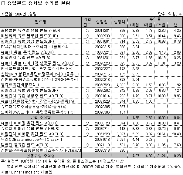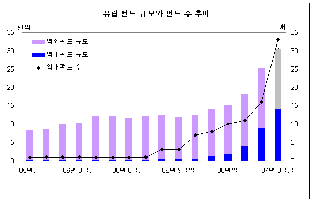 유럽지역에 투자하는 해외펀드의 규모는 국내와 국외설정 모두 합쳐 2006년말 1조 5,114억원에서 2007년 2월말 현재 2조 5,435억원까지 성장했다. 유럽펀드가 투자자들의 관심을 끌자 운용사들은 서둘러 유럽펀드들을 출시하기 시작했다. 해외펀드 비과세 조치 발표까지 한몫 거들면서 역내 유럽펀드는 연초이후 23개가 새로 만들어 졌으며 1,803억원이었던 역내 유럽펀드 투자규모는 3월말 현재 1조 4,053억원으로 석달만에 8배 가까이 증가했다.