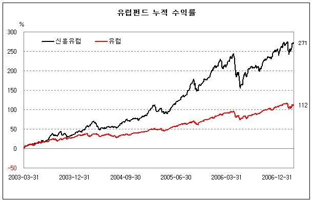 특히 유럽의 주식시장이 상승세를 보이기 시작한 2003년 4월 이후 유럽과 신흥유럽 주식펀드의 누적수익률을 보면, 지난 4년동안 각각 112%와 271%의 수익을 기록하며 안정적인 성장세를 보이고 있다. 최근 유럽은 달러화 대비 유로화 강세, 유로통합 이후 활발하게 진행되는 기업간 인수합병, 구조조정에 따른 유럽 기업 수익성 제고, 실업률 감소, 소비심리 상승 등의 요인들이 반영되며 성장세를 보이고 있다. 이런 경제성장 덕에 3월말에는 러시아와 동유럽을 포함한 유럽 24개 증시의 시가총액이 제 1차 세계대전 이래 처음으로 미국 증시의 시가총액을 앞지르는 일이 발생하기도 했다.
