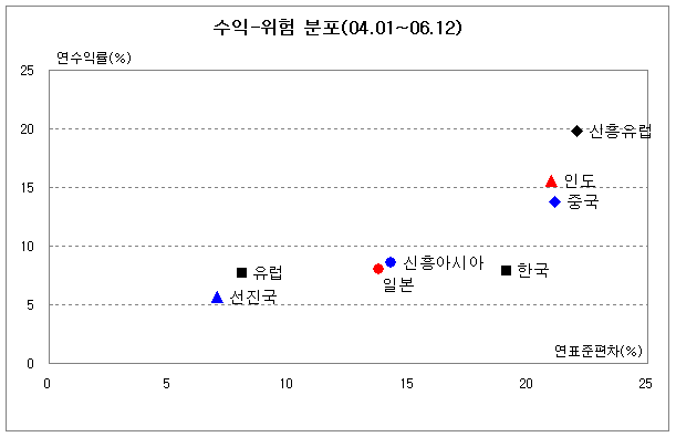 최근 3년간 MSCI 주요 지수의 수익률과 위험 특성을 살펴보면, 유럽을 비롯한 선진국들이 상대적으로 저위험과 저수익을 보인 반면 신흥유럽은 고위험 고수익을 나타내고 있다. 하지만 같은 기간 한국을 비롯한 신흥아시아 국가들의 높은 위험에도 불구, 유럽시장과 비슷한 수익을 보였음을 봤을 때 유럽의 위험대비 수익은 꽤 매력적이라고 볼 수 있다. 그러나 이는 유럽지역의 수익률이 양호했던 최근 3년을 기준으로 작성된 것으로 연도별 및 측정시점별로 수익과 위험이 얼마든지 확대될 수 있다는 점을 고려할 필요가 있다.