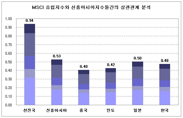 현재 유럽주식 투자에 있어 많이 활용되고 있는 벤치마크지수는 MSCI 유럽지수인 MSCI 유럽지수와 각 지역의 MSCI지수와의 상관관계 분석을 살펴봤다. MSCI유럽지수는 선진국지수와의 상관계수가 0.94인 반면 국내 투자자들의 투자비중이 높은 중국(0.40), 인도(0.42) 등 신흥아시아지수(0.53)와의 상관관계가 낮게 나타나고 있다. 또한 한국지수와의 상관관계도 0.48로 낮게 나타나고 있는데, 이는 국내 투자자들에게 선진국으로 통용되는 유럽시장이 분산투자의 기회를 제공할 수 있음을 의미하는 것이다.