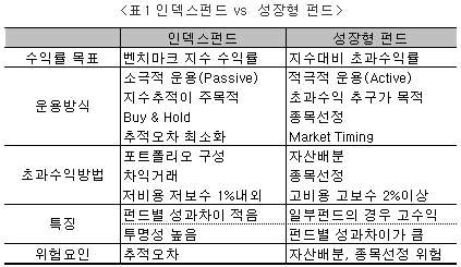 그 결과 ETF, 인덱스펀드, 성장형펀드 각각 1%내외, 2.6~8.7%, 9.95~24.93%의 수익률 차이를 보였다. 이는 성장형펀드의 경우 펀드가 격차가 심해서 어떤 펀드를 선택하느냐가 큰 영향을 미치지만, 인덱스펀드의 경우 펀드간 수익률 격차가 상대적으로 심하지 않음을 알 수 있다. ETF가 일반인덱스펀드보다 수익률 격차가 작은 것은 대다수 인덱스펀드가 인덱스를 추종하되 초과수익률을 추구하는 인핸스드 인덱스(일명 인덱스알파) 펀드이기 때문이다.
