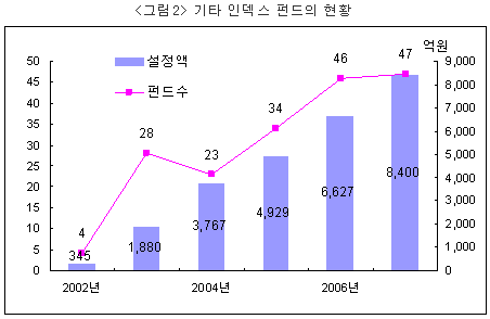 최근 들어서는 KOSPI200을 추종하는 데서 벗어나 약세시장에 초점을 맞춰 주가지수가 하락하면 수익이 나도록 설계된 베어마켓 펀드를 비롯하여, KRX100 지수, 배당지수, 기업구조개선지수 등 다양한 지수를 추종하는 많은 기타 인덱스 펀드들이 출시되었다.