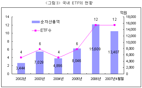 2006년말 현재 글로벌 ETF는 16개 지역에 상장되어 종목수 732개, 자산규모 5,739억 달러(533.7조원)에 이르고 있으며, 이중 미국, 유럽, 일본 등 선진국이 92.5%를 차지하고 있다. 이에 비해 국내 ETF시장의 성장은 더딘 실정이다.