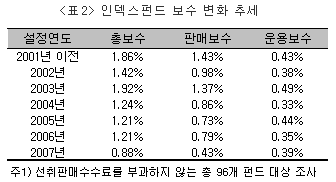 인덱스 펀드의 보수 변화(ETF 제외)를 살펴보면 2003년까지 연간 총보수율이 증가세에 있다가 그 후 점차 감소하여 1%미만(대상펀드 단순평균)인 현 수준에 이르렀다. 이러한 보수율 인하추세는 총보수중 구성비중이 가장 높은 판매보수가 절반 가까이 떨어졌기 때문이다. 이는 경쟁상품인 ETF의 총보수율이 평균 0.48%로 저렴한 것에 영향을 받은 것으로 보인다. ETF의 보수율이 저렴한 것은 판매보수가 매우 낮기 때문이다. 대신 ETF는 매매할 때 증권사에게 거래수수료를 지불해야 한다.