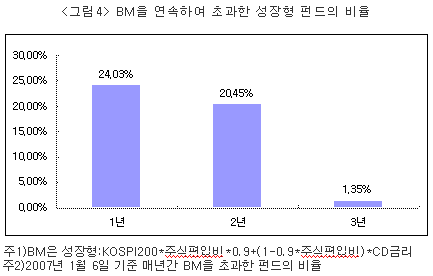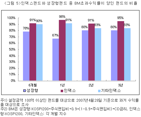 선진 시장인 미국의 경우 최근 10년간 전 기간에 걸쳐 성장형 펀드의 평균 수익률이 S&P500지수에 못 미치는 것으로 나타났다. 이는 국내에서도 비슷한 실정이다. 2007년 1월 6일을 기준으로 100억 이상의 성장형 펀드를 대상으로 한 조사결과 지난 3년간 연속으로 BM(벤치마크)수익률을 초과한 펀드는 한 개로 전체 대상 펀드 74개의 1.4%에 불과했다. 2년간 연속으로 BM을 초과한 펀드는 20.5%, 1년간 BM을 초과한 펀드는 24.0%를 보였다. 즉, 아무리 적극적인 운용을 한다고 하더라도 장기간 연속해서 시장보다 우월한 성과를 보이기가 얼마나 어려운지를 보여주는 것이다.