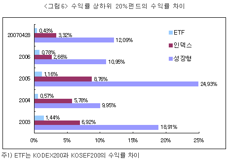 둘째로, 인덱스펀드와 성장형펀드의 유형내에서의 수익률 편차를 비교해보았다. 각 유형에서 상위 20%를 보인 펀드와 하위 20%를 보인 펀드의 평균수익률을 차감하여 비교하였다.