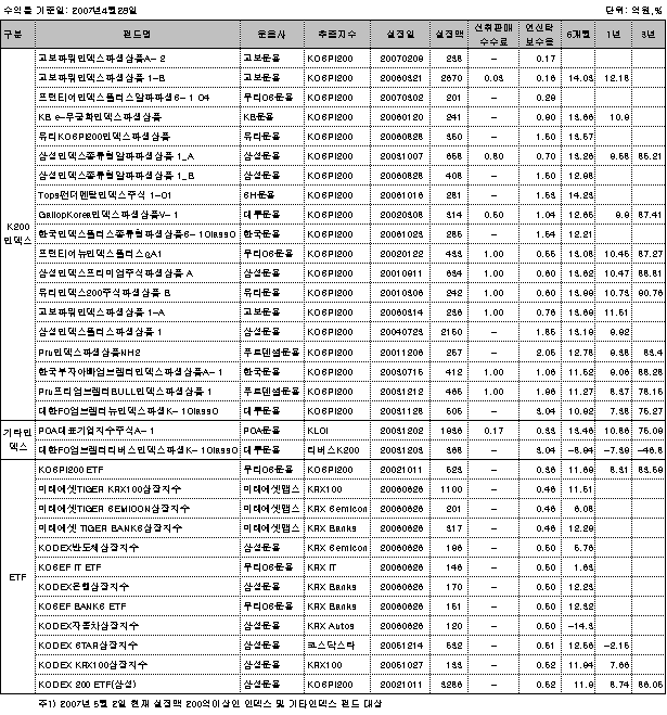 코스피200 인덱스펀드와 기타인덱스 펀드 중에는 인덱스펀드의 한 종류인 ETF(상장지수펀드:Exchange Traded Fund)도 있다. ETF는 인덱스펀드를 거래소에 상장시켜 주식처럼 거래할 수 있게 한 것으로 인덱스펀드와 주식의 장점을 모두 지닌 상품이다.