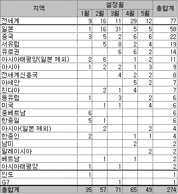 공모 해외펀드(역외설정 펀드 제외)의 설정액 변화를 지역별로 자세히 살펴보면 다음과 같다. 글로벌 신흥국의 성장세가 꺾인 반면 유럽권의 폭발적 성장세가 돋보인다. 글로벌신흥국의 경우 2조에서 2조6천억으로 6천억이 증가한 반면, 서유럽의 경우 연초 784억원에서 5월18일현재 1조8천억원으로 무려 23배 성장하였으며, 동유럽펀드도 펀드 수의 증가와 함께 설정액이 6배 늘어난 모습을 보였다. 그 외 리츠재간접펀드도 작년에 이어 인기를 끌어 6조1천억원에 이르렀다.