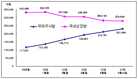 해외주식형 펀드의 강세로 요약할 수 있는 2007년 펀드시장의 동향은 설정액 변동을 살펴보면 더욱 분명히 알 수 있다. 33조원으로 시작한 국내성장형펀드의 경우 5월18일 현재 27조 9천억원으로 재투자분이 포함된 것을 감안하면 꾸준한 감소세를 보이고 있다. 이에 비해 국제주식형은 11조 7천억에서 23조 1천억원으로 두 배 가까운 성장세를 보이고 있다.