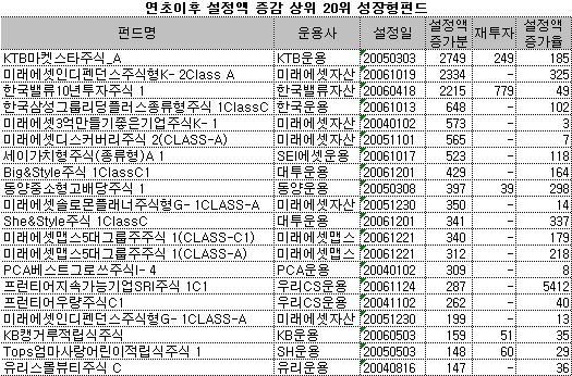 2007년 설정된 국내 공모 주식성장형펀드의 특징을 살펴보기 위해, 연초이후 설정액이 증가한 상위 20개펀드를 살펴보았다. 그 결과 지난 12개월 수익률이 상위 5%안에 드는 KTB운용의 ‘KTB마켓스타주식_A'가 수위를 차지하였다. 그 외 연초이후 설정액이 증가한 펀드들의 특성을 살펴보면, ’한국밸류10년투자주식‘같은 가치주펀드에 사람들의 관심이 집중되었음을 알 수 있다. 삼성그룹주 펀드의 후속작인 ’한국삼성그룹리딩플러스종류형주식‘과 ’미래에셋맵스5대그룹주주식‘ 등의 그룹주 펀드에도 꾸준하게 자금이 유입되었다. 최근의 중소형주 강세장에 힘입어 늘 수익률 상위권을 차지했던 ’동양중소형고배당주식‘과 ’유리스몰뷰티주식‘ 등 중소형주 펀드에 대한 투자도 증가하였다.