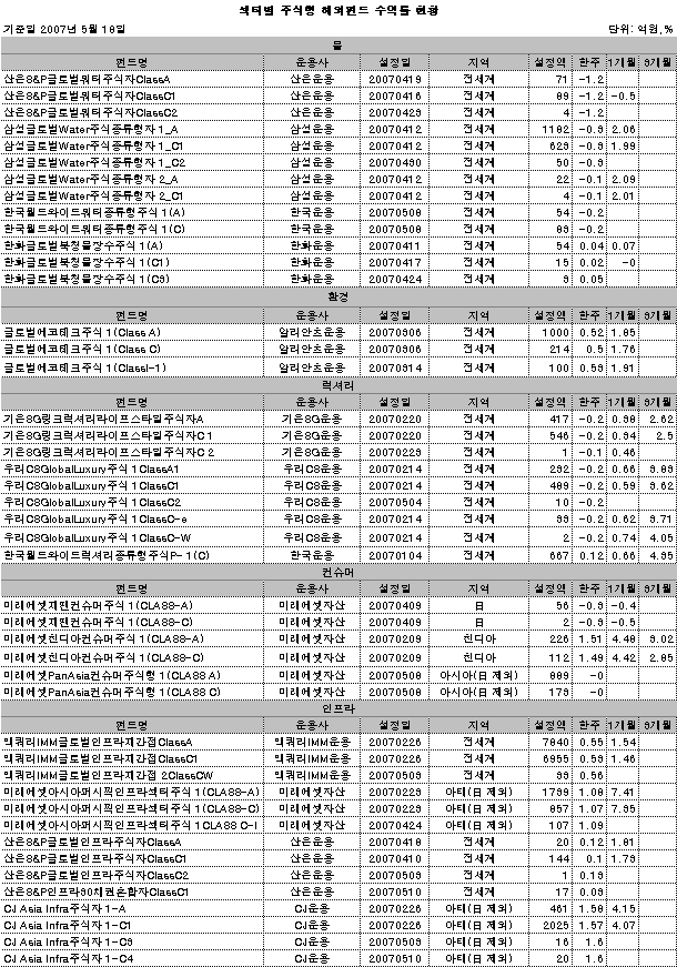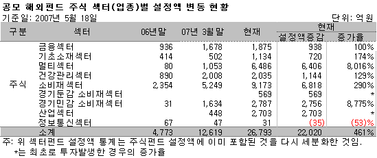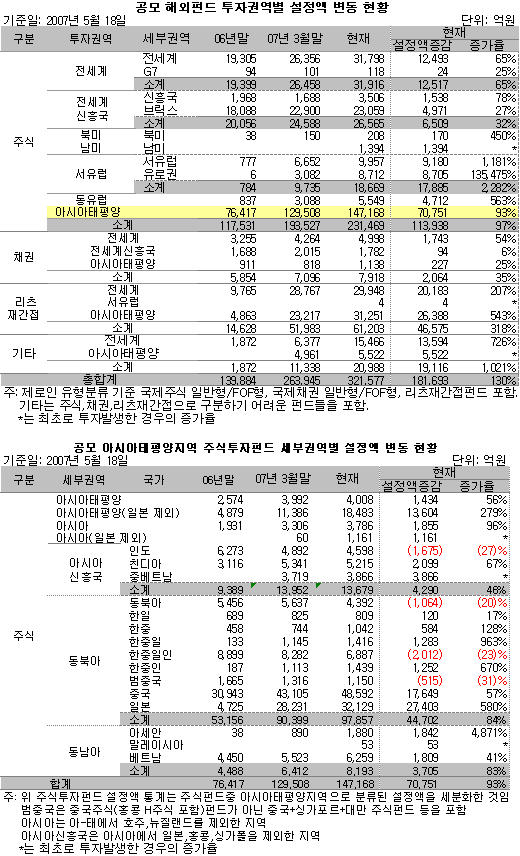 2007년 5월까지 펀드시장의 화두는 해외투자펀드이며 눈에 띄는 변화는 투자지역의 다변화 및 탈지역 섹터/테마 펀드의 강세이다. 이는 작년 중국 등 이머징 마켓의 수익률 호조와 정부의 해외펀드 해외주식매매차익 비과세 조치에 힘입은 바 크다. 2007년 초부터 5월 18일까지 설정된 펀드 현황(종류형펀드 제외 클래스펀드 포함)을 살펴보면 제로인 분류 기준상 국내 성장형 주식펀드는 67개가 설정된 반면 동기간 국제주식형 펀드는 274개가 설정되어 국내펀드 대비 4배 넘는 모습을 보였다.