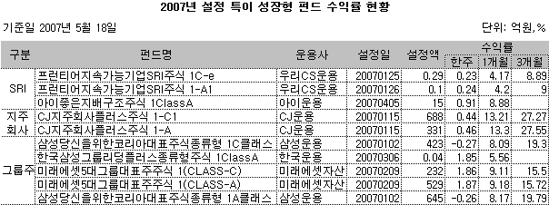 해외펀드에 비해선 전반적으로 부진하지만 국내 성장형펀드(주식편입비 70%초과)도 2007년 5월 18일까지 총 67개가 설정되었다. 주목할만한 것은 2006년부터 시작된 사회책임투자펀드와 그룹주 펀드의 지속적인 성장이다.